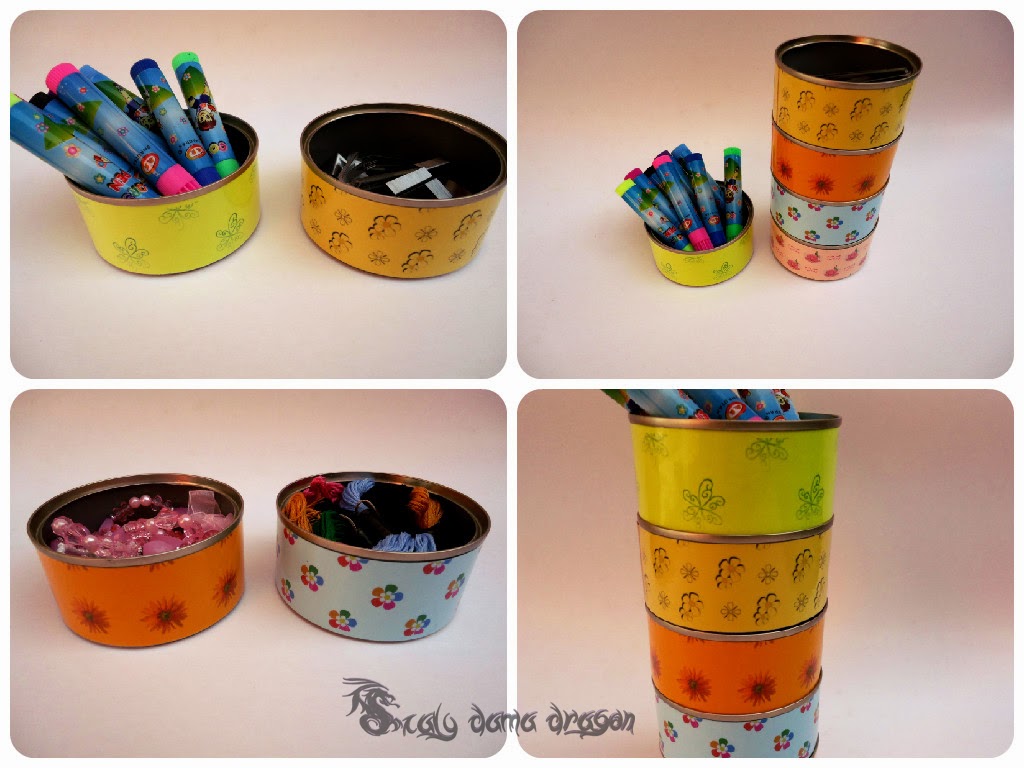 Hola, mis Dragoncill@s esta semana les traigo otra manualidad de reciclaje muy económica de hacer y practica, se trata de un organizador de latas de atún. las puedes colocar en tu oficina y rellenarlas de materiales de la misma oficina valga la redundancia, o en tu habitación le hechas tus pulseras o aretes, yo deje 2 para mi taller de manualidades y las otras las coloque en mi habitación y quedaron Geniales.
