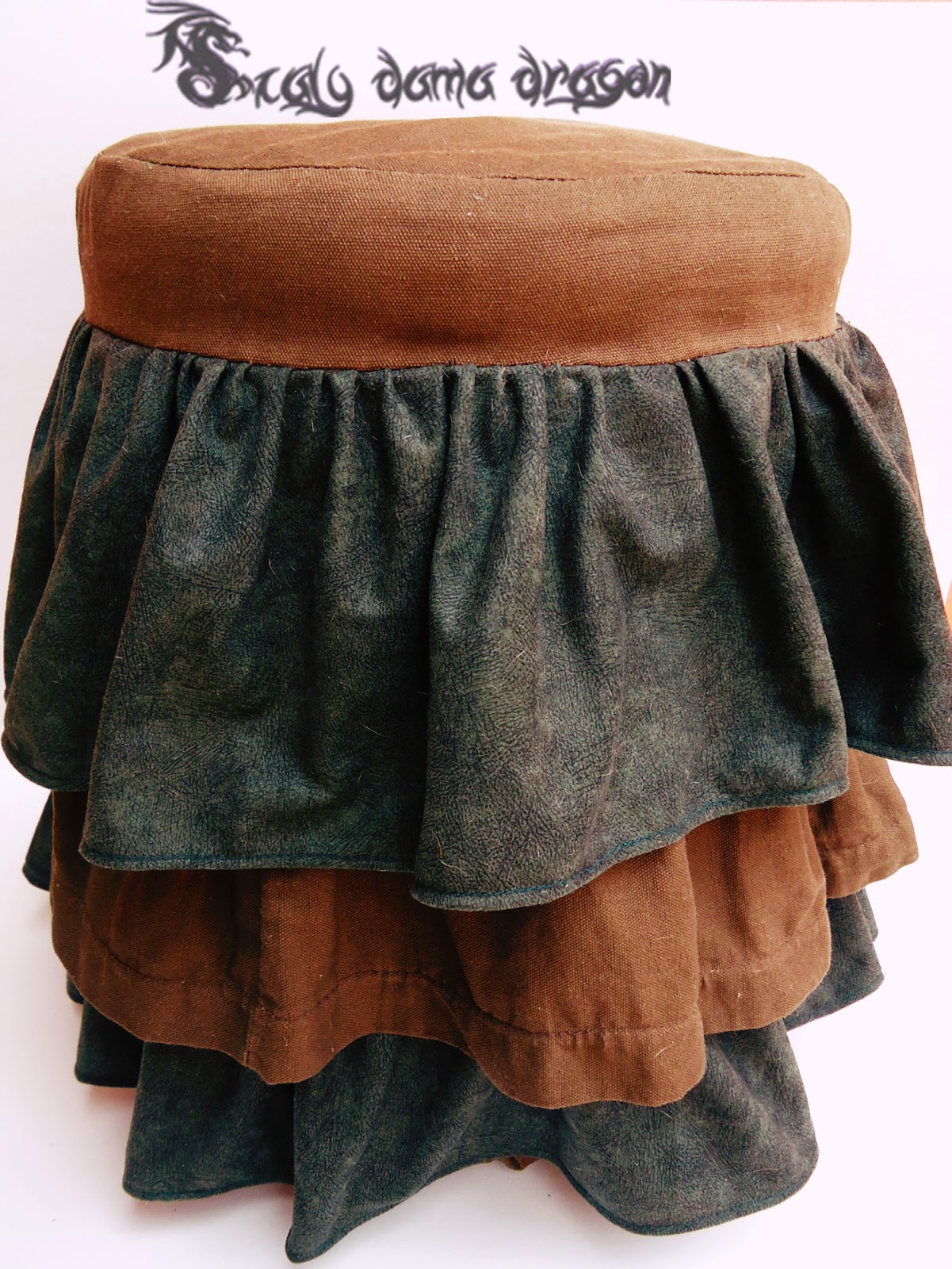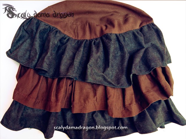 La tela que utilice para el forro externo era un vestido café y los vuelos verdes eran de un pantalón así que este trabajo es 100% con materiales reciclados.