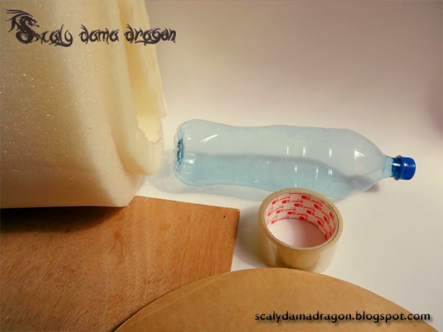 pegamos o clavamos nuestros 2 círculos al trozo de madera larga de forma que este sera el que reciba todo el peso por eso debe de quedar en medio y luego como se ve en la imagen lo rodemos con la botellas platicas y las sostenemos con la cinta de embalaje o tape y así quedara bien sujeto.